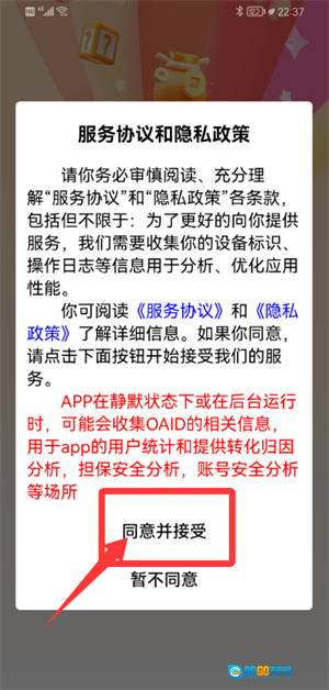 1. 启动应用,确认服务协议及隐私政策,点击“同意并接受”继续。