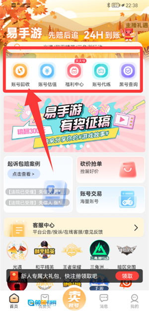 3、在首页呈现账号回收、账号估值等功能的入口,点击账号回收即可进入。