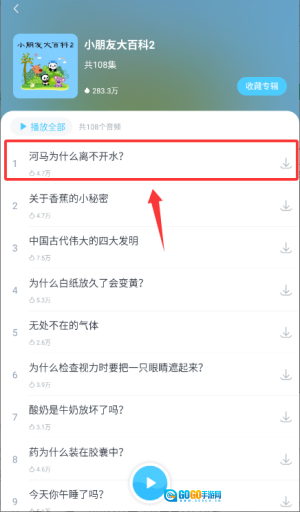 3、在列表里挑选诸如“河马为什么离不开水”这样的具体问题,然后进入播放页面。