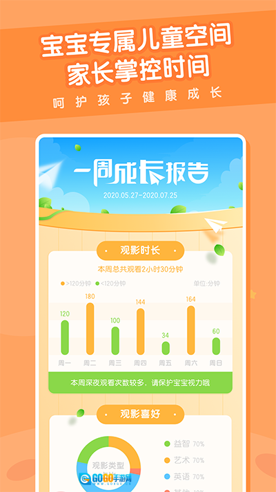 2. 成长报告功能会每周生成观影行为分析,借助内容偏好图谱和时长分布曲线,以直观的方式呈现儿童的兴趣发展轨迹。