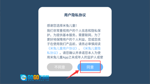 1. 于用户隐私协议窗口点击“同意”,就能进入米兔儿童应用。