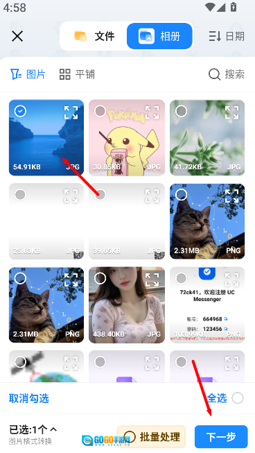 3、轻点添加图片按钮,挑选需要转换的图片文件,接着点击“下一步”,进入设置界面。