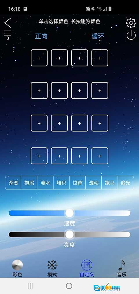 3、为灯光提供自定义模式选色功能,该功能内容丰富、灵活多变,同时支持对速度和亮度进行调节。