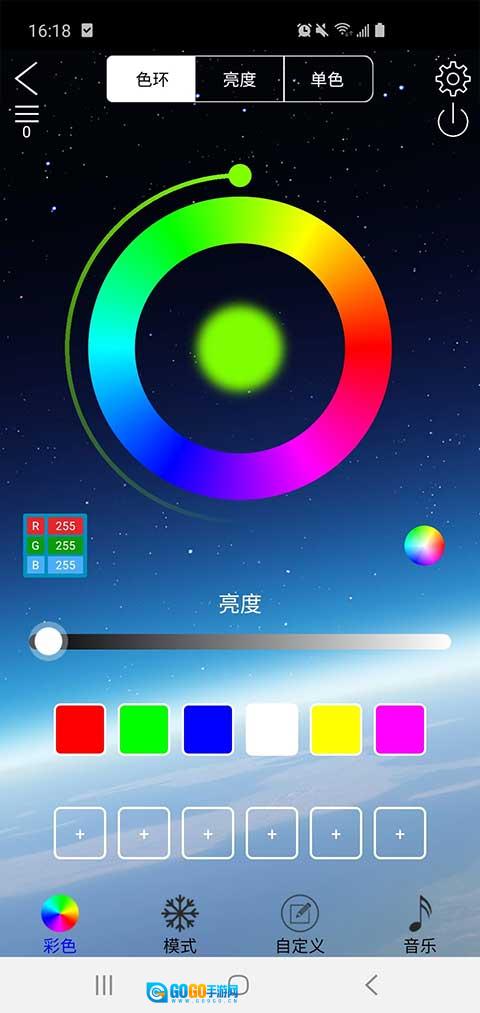 4、该软件可借助手机蓝牙与WIFI,对LED灯光的颜色、亮度及变化模式分别进行控制。