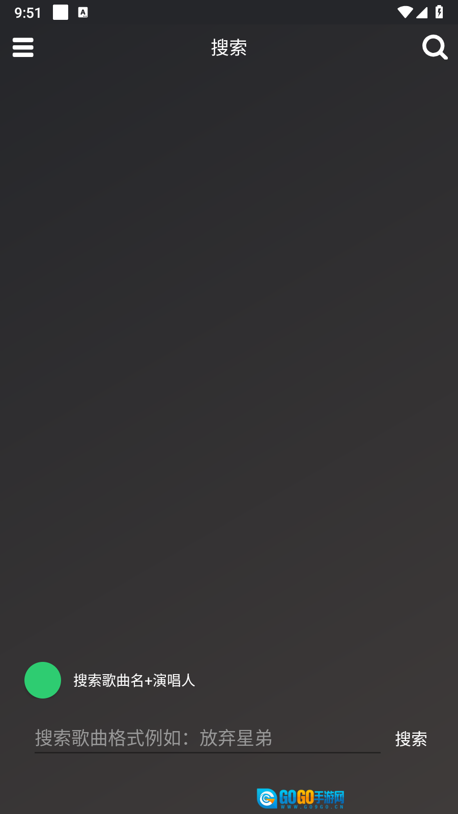 1.打开轩哥音乐App,点击首页右上角“放大镜”图标,输入歌曲名、歌手名或专辑名