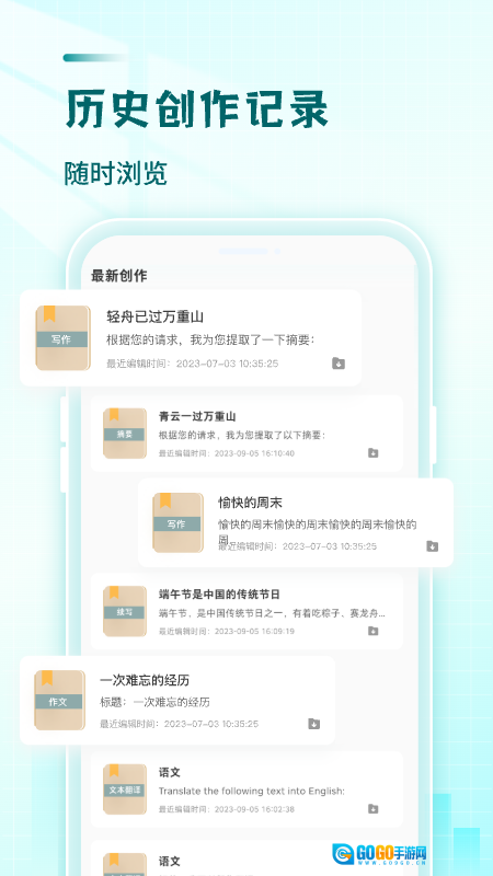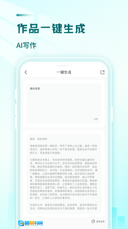 文章作文生成器App,一款助力提升写作能力的软件。它具备一键生成作文、智能续写、AI文案创作、AI写小说、AI对对联等诸多实用功能。用户能够在海量作文素材中自由筛选并加以运用。写作完成后,还可享受在线自动检测服务。不仅如此,每一次的创作记录都能在线查看,全方位助力大家轻松产出高品质文章。别犹豫啦,快来体验吧!