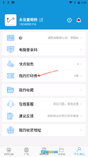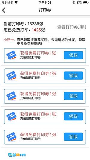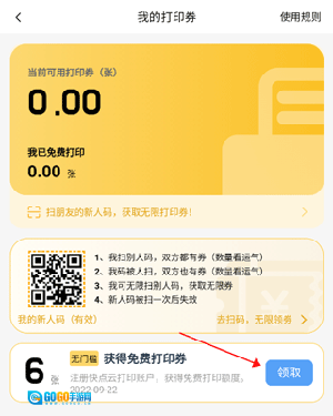 2、找到【我的打印券】并点击,首次注册的新用户点击【领取】即可获取免费打印券。