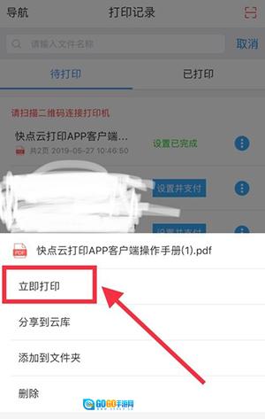7、完成支付后,已支付的打印文档会出现“设置已完成”提示。接着点击右侧的“三个小点点”,选择“立即打印”,此时会弹出“二维码扫描”界面。通过扫描打印机上的二维码来连接打印机(也可直接输入打印机编号,然后点击确定)。随后,打印记录处会显示文件传输中,传输结束后,稍等几秒,文件便会打印出来。
