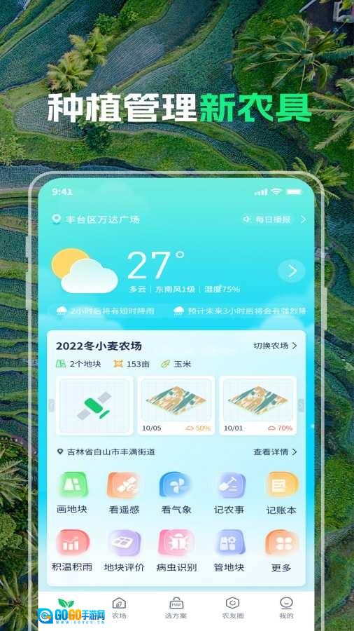 MAP智农测亩仪安装是一款针对现代大规模农业管理打造的专业工具,具备全方位的农业聚合功能。涵盖天气预报、农场查询、画地块、查看遥感影像、了解气象信息、记录农事活动、使用记账本、统计积湿积雨数据、进行病虫识别、实施地块管理等。通过遥感影像,可洞察每块农作物的生长态势;精准雷达天气功能,为农业生产提供有力支持,同时还支持绘制地块面积。