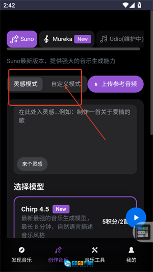 4、轻点创作板块,即可在灵感模式与自定义模式中任选其一。