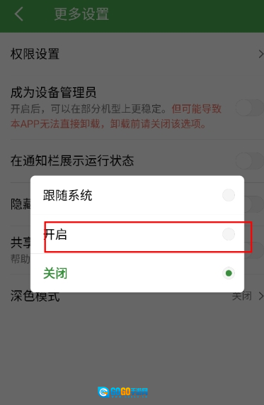 4、在窗口中点击“开启”,就能看到应用主题呈现出深色效果。
