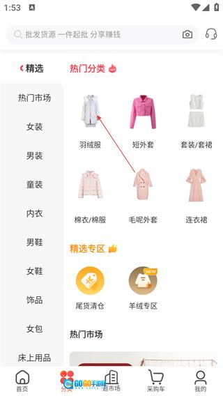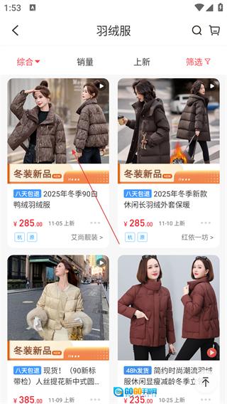 2. 在分类页面当中,挑选【羽绒服】这一类别,进而进入到羽绒服商品列表页面。