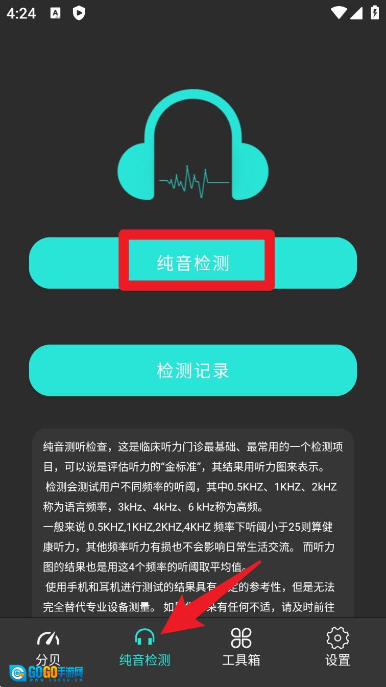 2. 如果想要检测听力状况,可以切换到底部的纯音检测页面,点击按钮进入听力测试功能的界面。