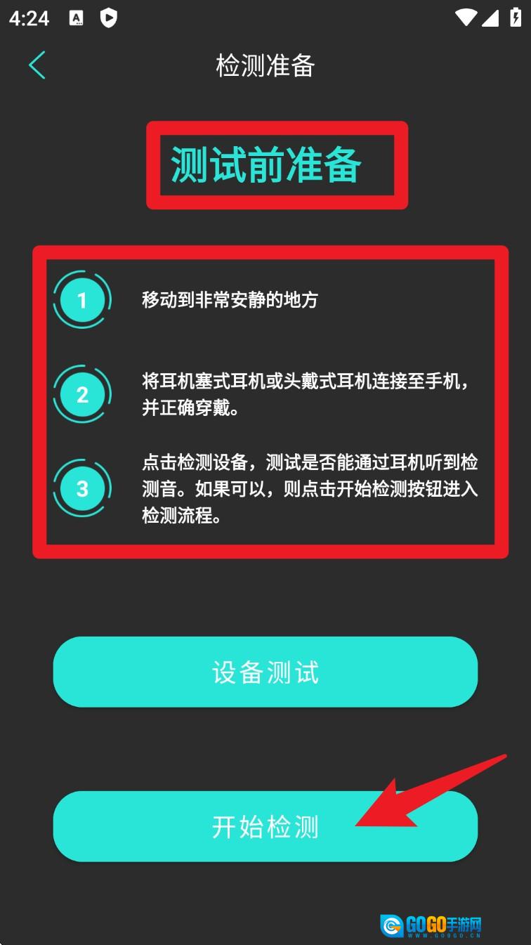 3. 在进行检测之前,请先阅读准备步骤。确保佩戴好耳机,并移步至安静的环境中,之后点击“开始检测”,从而启动测听流程。