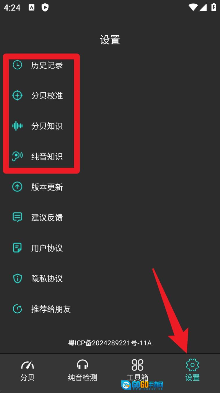 5. 用户可在设置里找到历史记录、校准功能以及听力相关知识,这些内容能助力用户更透彻地理解检测数据。