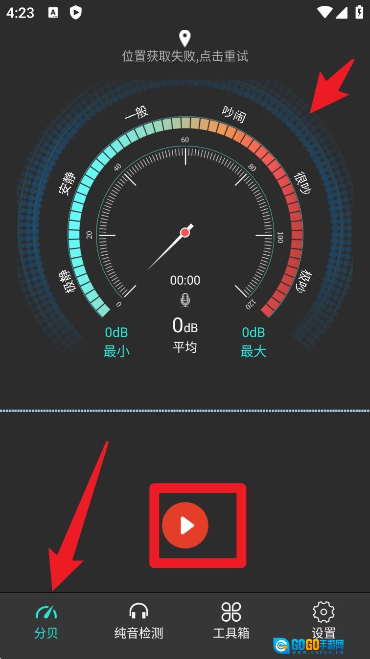 1. 打开App,默认会进入分贝页面,点击页面中间的红色播放键,就能开启环境噪音实时检测。