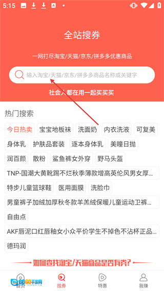 2. 在【全站搜券】的搜索框内输入商品名称或者关键字来搜券。