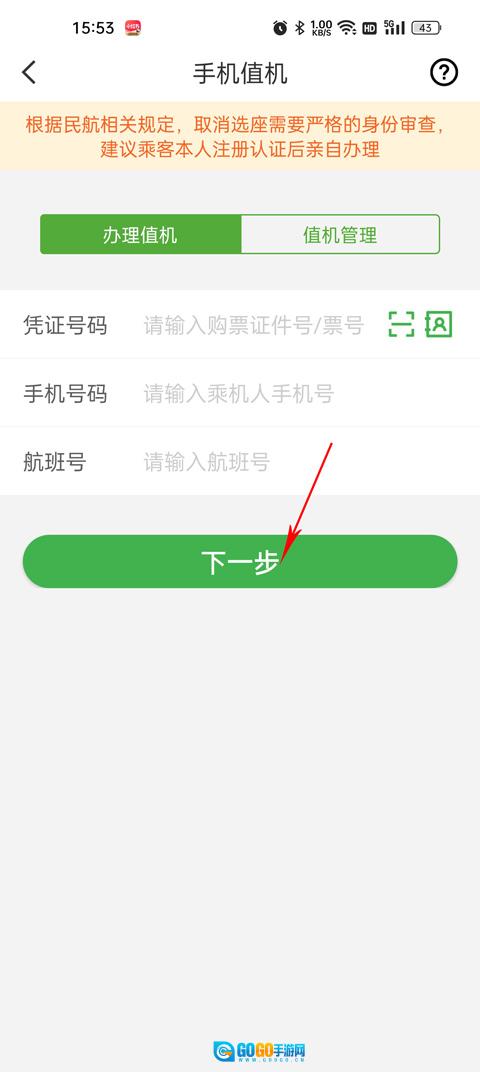 3、依据界面给出的提示填写相关信息,随后点击“下一步”,即可开展值机操作。
