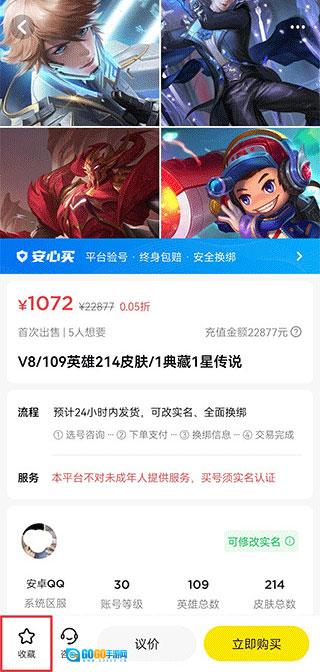 在买号页面,点击进入游戏账号购买页面,然后点击左下角的收藏按钮就行。