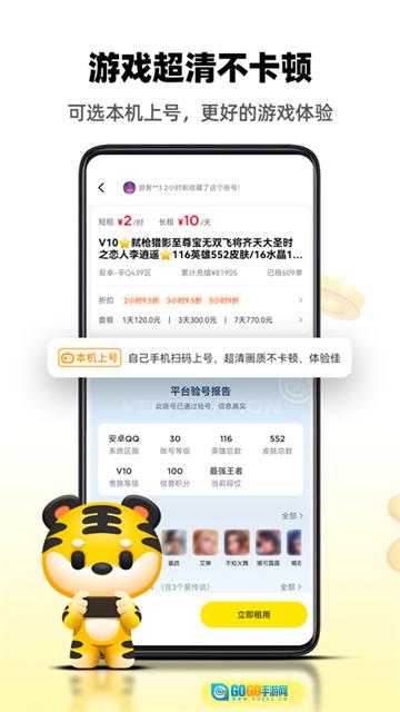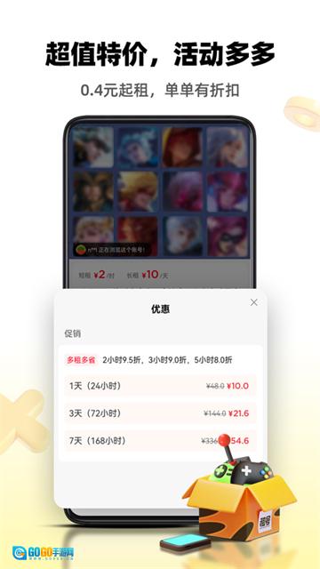 畅享游戏出租自由,每日都能体验包租公包租婆的快乐。通过共享游戏账号轻松赚取收益,一键托管,安全有保障。游戏投资稳享固定回报,还能分时多次出租。把限量皮肤道具分享给志同道合的游戏伙伴,你的快乐由我们买单。王者荣耀、吃鸡(和平精英)、LOL英雄联盟、火影忍者等热门游戏皆可参与~