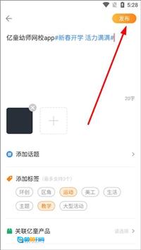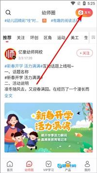 2. 进入幼师圈页面,用户能够浏览最新发布的话题文章,还能看到关注、环创、区角、运动等相关内容,点击页面右上角即可进行发布操作。