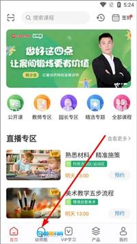 1. 首先打开应用并登录,进入到首页。在首页中,能够看到公开课、教师专区、园长专区、直播专区以及课程推荐等板块,此时点击直播专区。