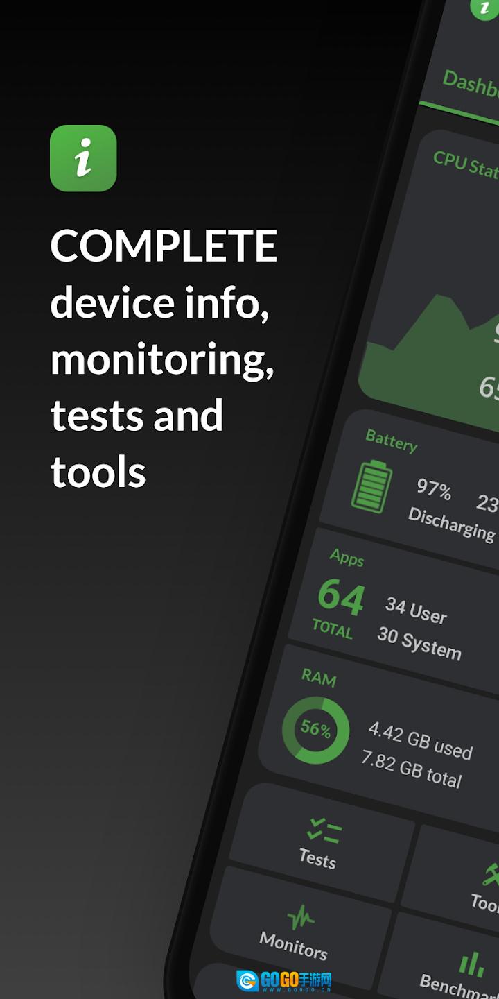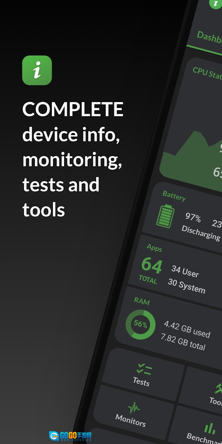 DevCheck是一款功能强劲的安卓设备硬件与软件信息应用程序。它能给出关于设备性能的全方位详尽信息,涵盖CPU与GPU的使用状况、电池健康程度、温度数据、传感器信息、设备详情等。