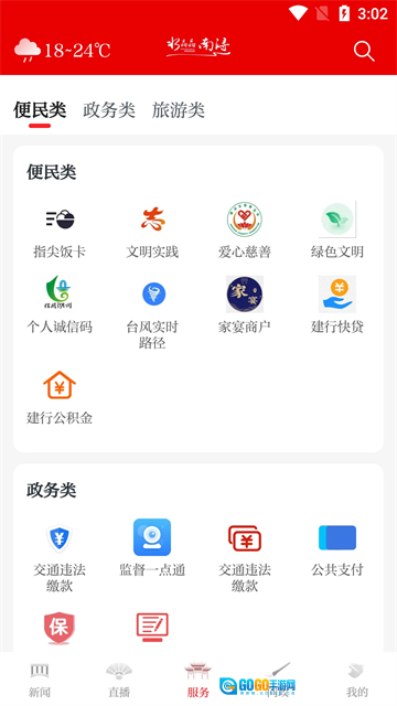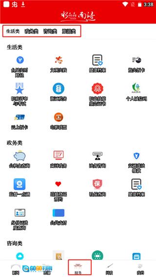 3、点击服务,里面提供生活类、政务类、咨询类、旅游类等等方面的服务;