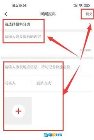 进入新闻报料界面,选择报料分类、输入报料内容、描述事发地点信息、联系人、联系方式、上传图片,点击【提交】。