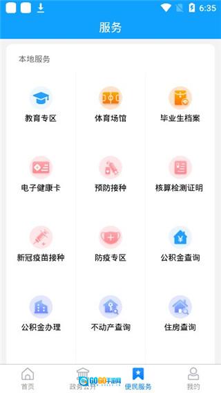 3、便民服务涵盖教育专区、毕业生档案、电子健康证、防疫专区、公积金查询等多项功能。
