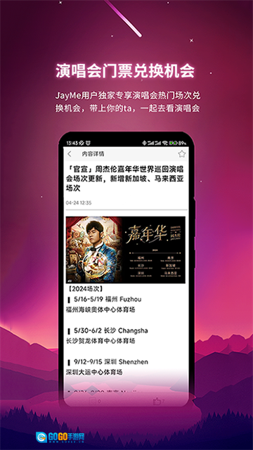 仅JayMe用户可独家享有演唱会热门场次的兑换机会,快带上你的那个ta,一同奔赴演唱会现场~