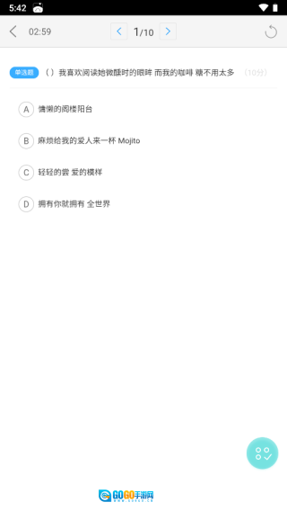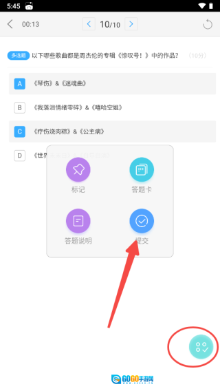 5、回答完10道题目之后,点击右下角图示所在位置,然后点击提交。