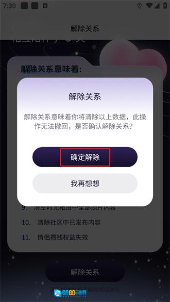 5、确认解除关系之后意味着的各个选项,紧接着往下方划去就会看到一个【解除关系】的按键;