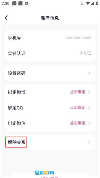 4、随后在账号信息中,下方会有一个【解除关系】的功能,点击这个选项进入到下一步的操作之中;