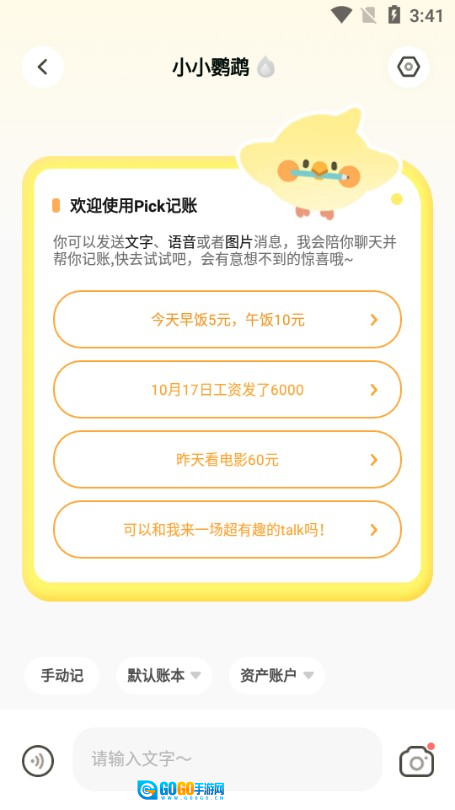 1. 下载安装pick记账免费版,就能和可爱的小小鹦鹉进行互动聊天啦。