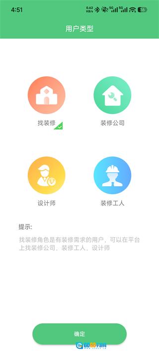 1. 打开易装修App后,第一步要选择【用户类型】,特别提醒:用户类型一旦选定便不可更改。