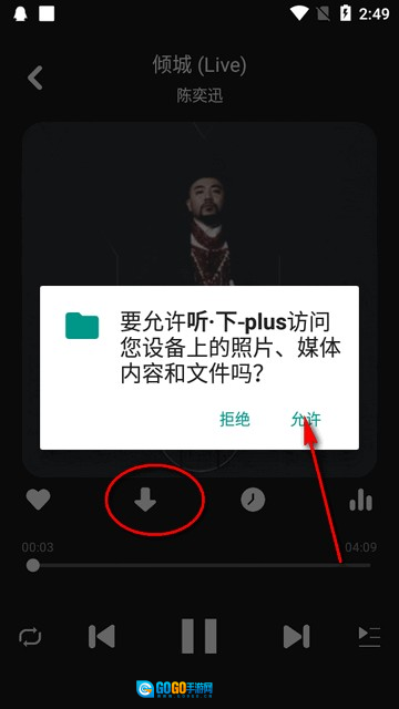 3、进入一首想听歌曲的播放界面,点击操作时,需要获取软件权限。