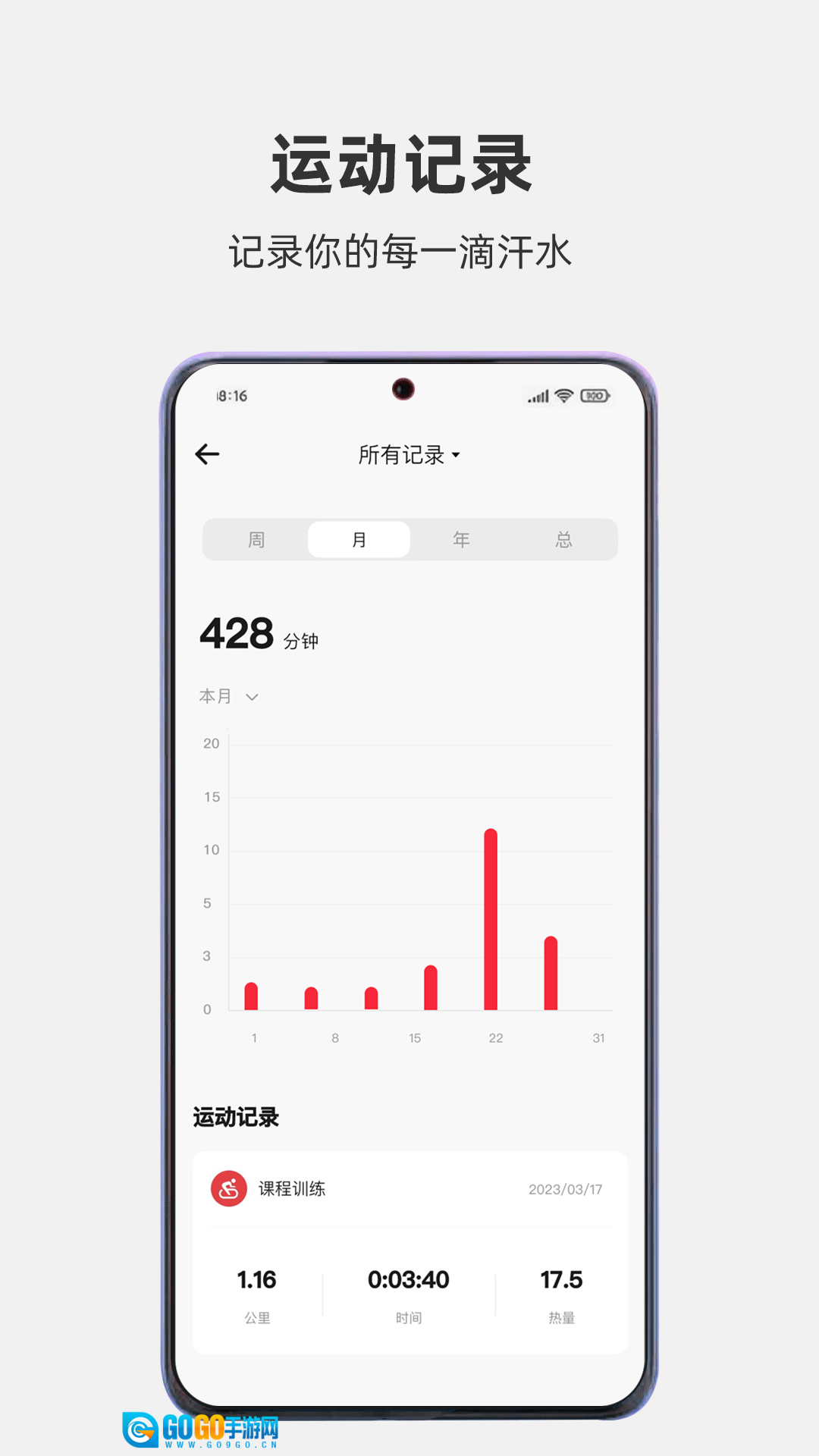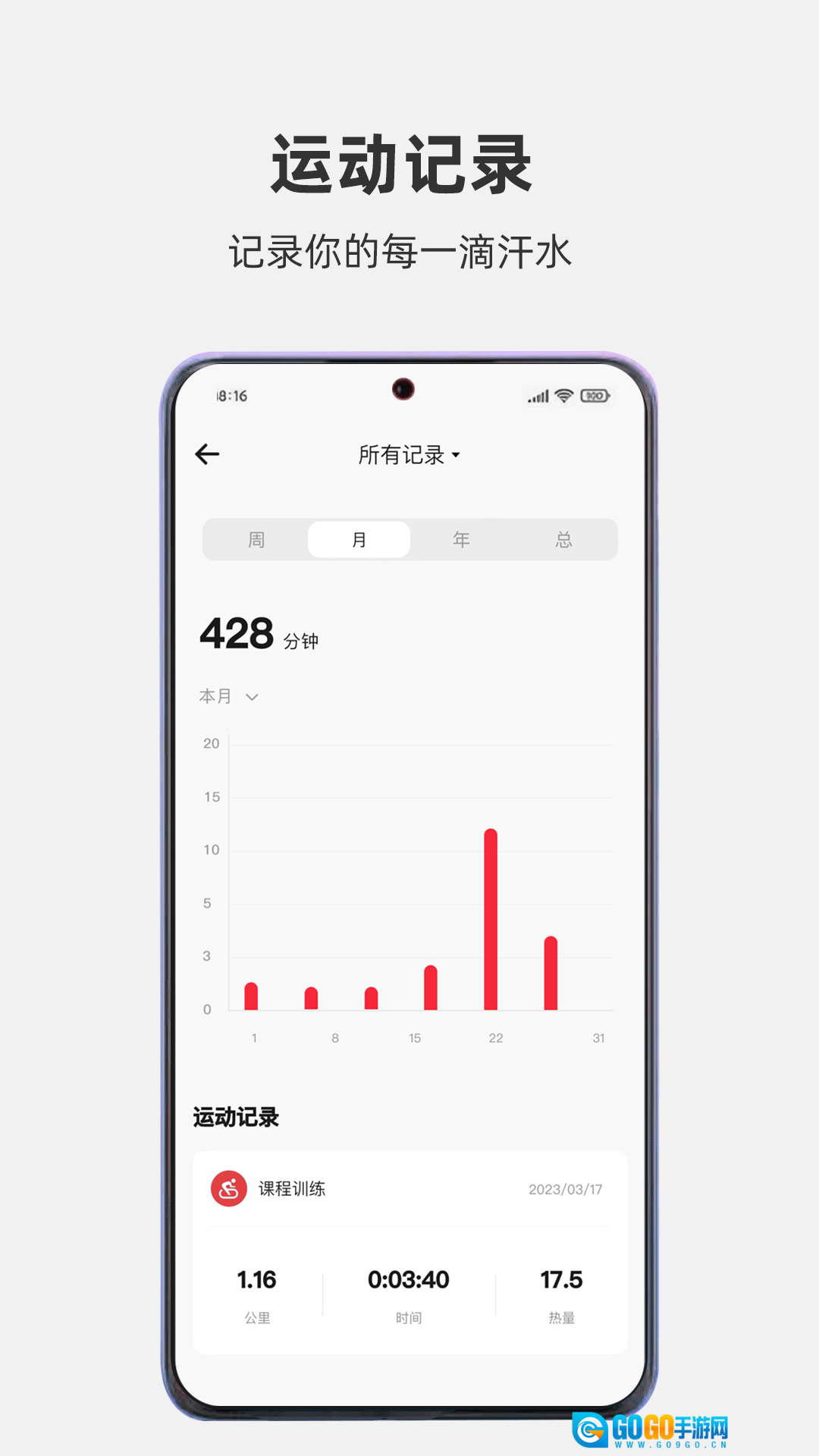 2、以直观图表呈现每月运动时长、各天运动数据,清晰记录每一滴汗水。