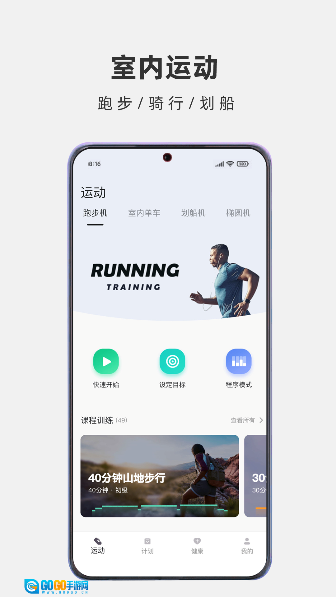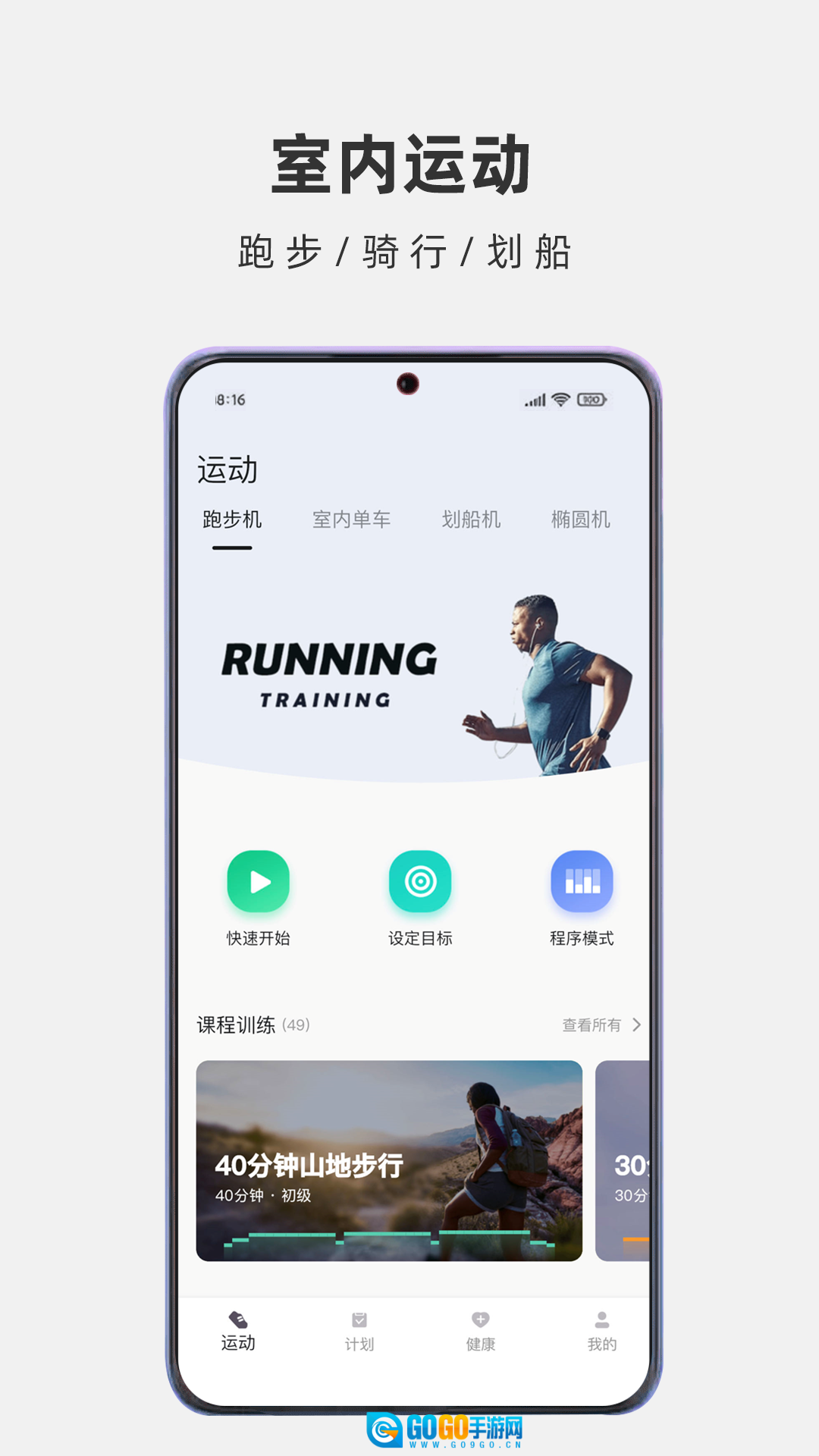 3、运动模式有快速开始、设定目标、程序模式,满足不同运动启动需求。