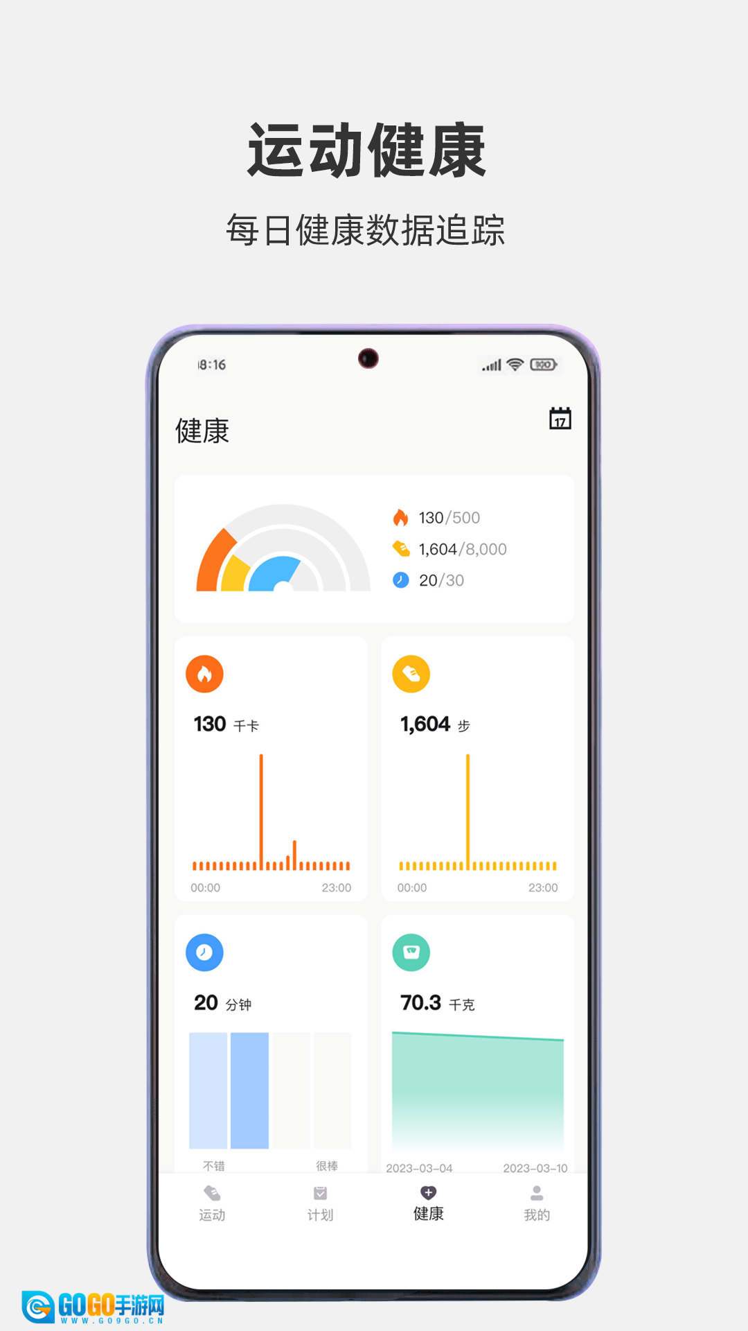 3、追踪千卡消耗、步数、运动时长、体重变化,以图表形式呈现数据趋势。