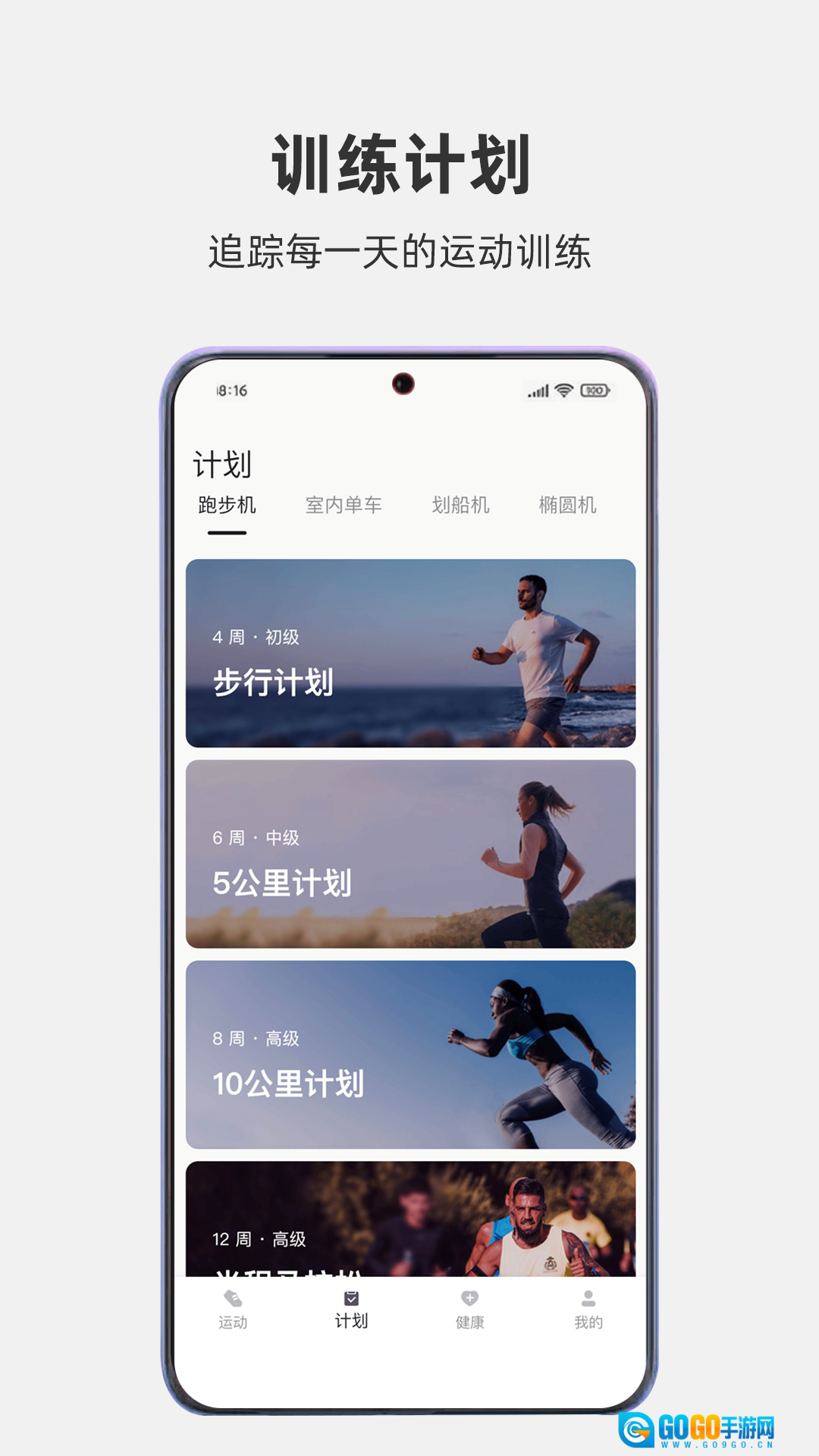 2、针对跑步机等设备,设置从初级到高级不同周期训练计划,适配不同运动水平。