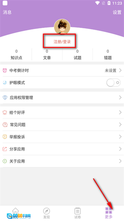 2. 开启软件,点击下方的“更多”选项,接着点击上方的“注册/登录”。
