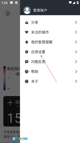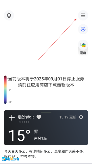 1. 在天气应用的界面上,【点击右上角的菜单按钮】,随即进入功能菜单界面。