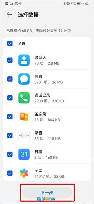 2、接着在旧手机的选择数据页面挑选要发送的数据,点击【下一步】按钮,将数据发送至新手机。