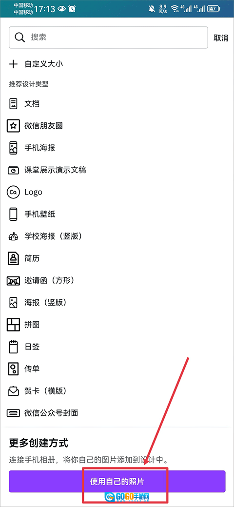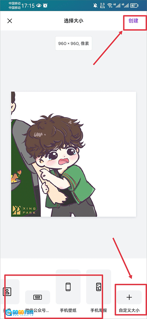 3、于相册里挑选照片后,紧接着选取图片大小。要是下方提供的大小不符合需求,可点击自定义大小。待大小选择完毕,点击创建即可。
