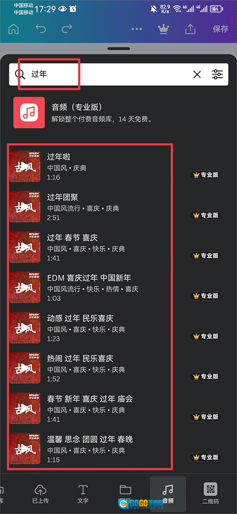 2、当进入音频界面,在其中搜索音频类型,挑选合适的音频添加就行。