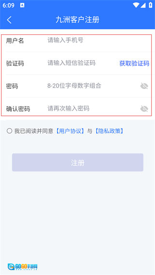 4、注册步骤如下:首先输入手机号,接着获取验证码,然后设置密码并进行确认,在勾选同意协议之后,点击注册按钮,即可完成账号创建。