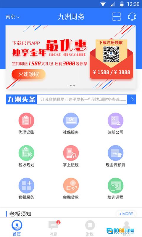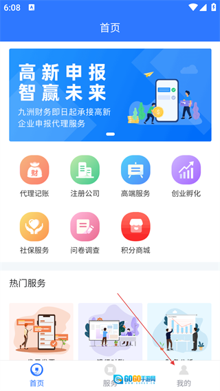 1. 当您进入九洲财务的首页后,能够选择诸如代理记账、注册公司之类的服务功能。点击页面底部的【我的】,即可进入个人页面。