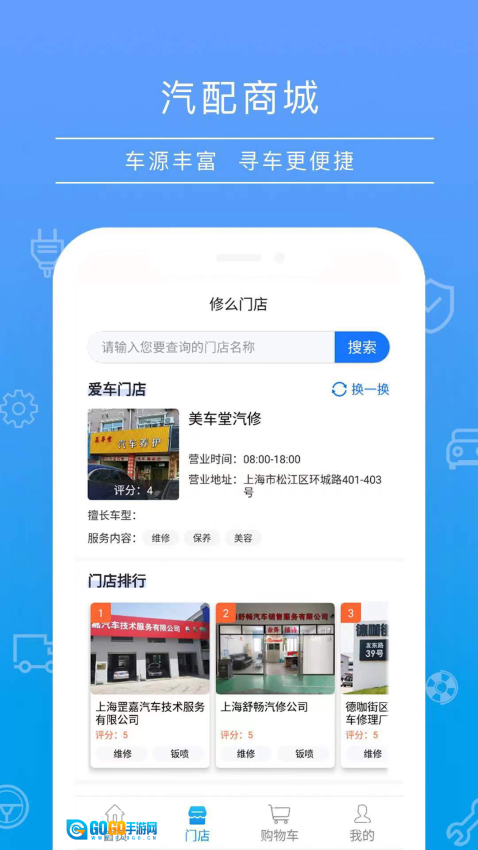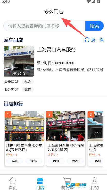 1. 打开门店板块,通过搜索或者查看爱车门店以及门店排行,来寻觅合适的汽车服务门店。