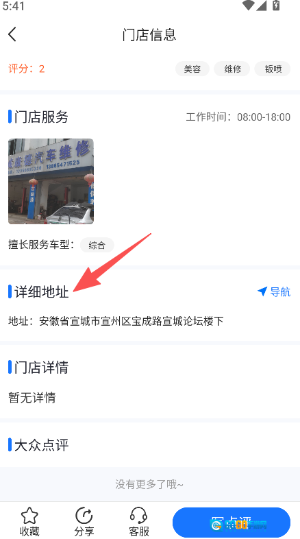 1. 门店信息十分全面,涵盖营业时间、地址、评分、擅长车型以及服务内容等方面的展示,助力车主从各个维度知悉门店状况,从而更方便做出选择。